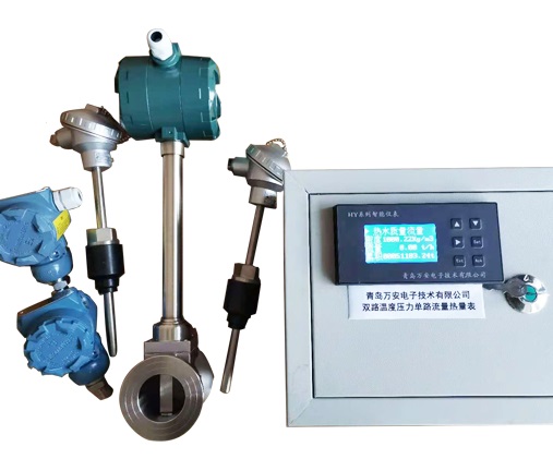 导热油热量表包含一台涡街流量传感器,两支热电阻采集温度信号,一台热量表。显示两路温度,一路流量。如果现场工况需要,可以分别在冷端和热端各安装一台涡街流量传感器,热量表就可以显示两路的温度,两路流量。